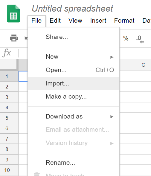 2. Import your 360Giving Excel or CSV file into Google Sheets. Select File > Import > Upload, and then select the file from your computer or drag and drop it into the window.