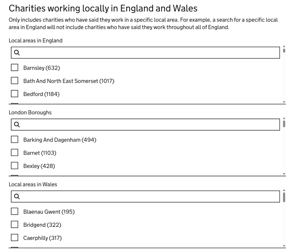 You can combine the filters to widen the search. Selecting ‘Throughout England and Wales’, ‘Throughout England’ and a ‘Local area in England’ will return charities that cover any of those areas.