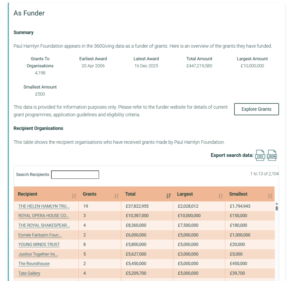 On the funder’s page, you’ll see a summary of grants and a table of recipients you can search, sort, or download.